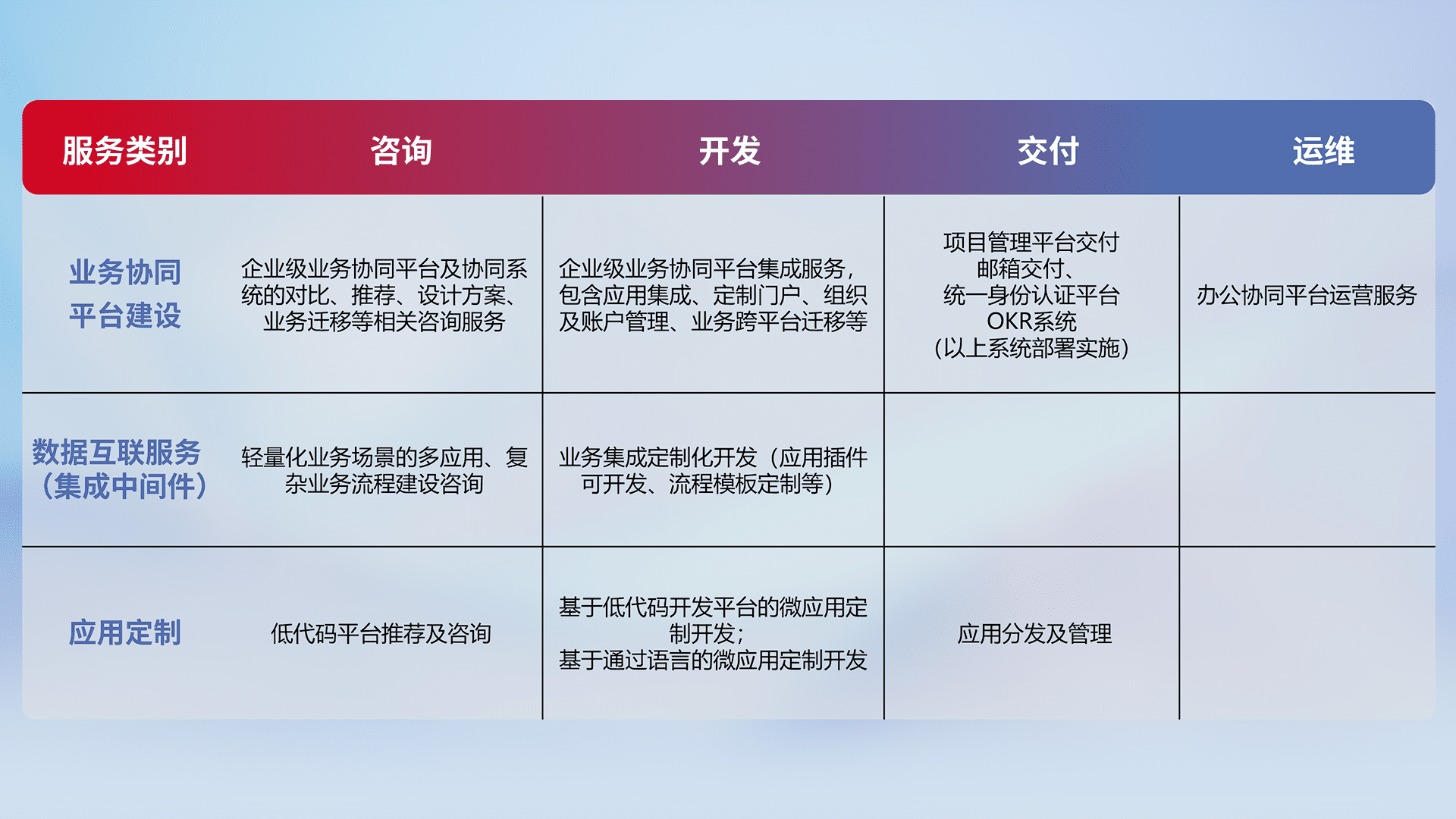 针对钉钉、、、、企微、、、IDaas等平台级产品提供产品的规划、、、方案、、交付、、、定制化开发等服务,,实现如统一协同办公、、、智能客户服务、、、、混合会议管理、、、智能数据查询、、等业务场景,,,,实现数字化转型。。。