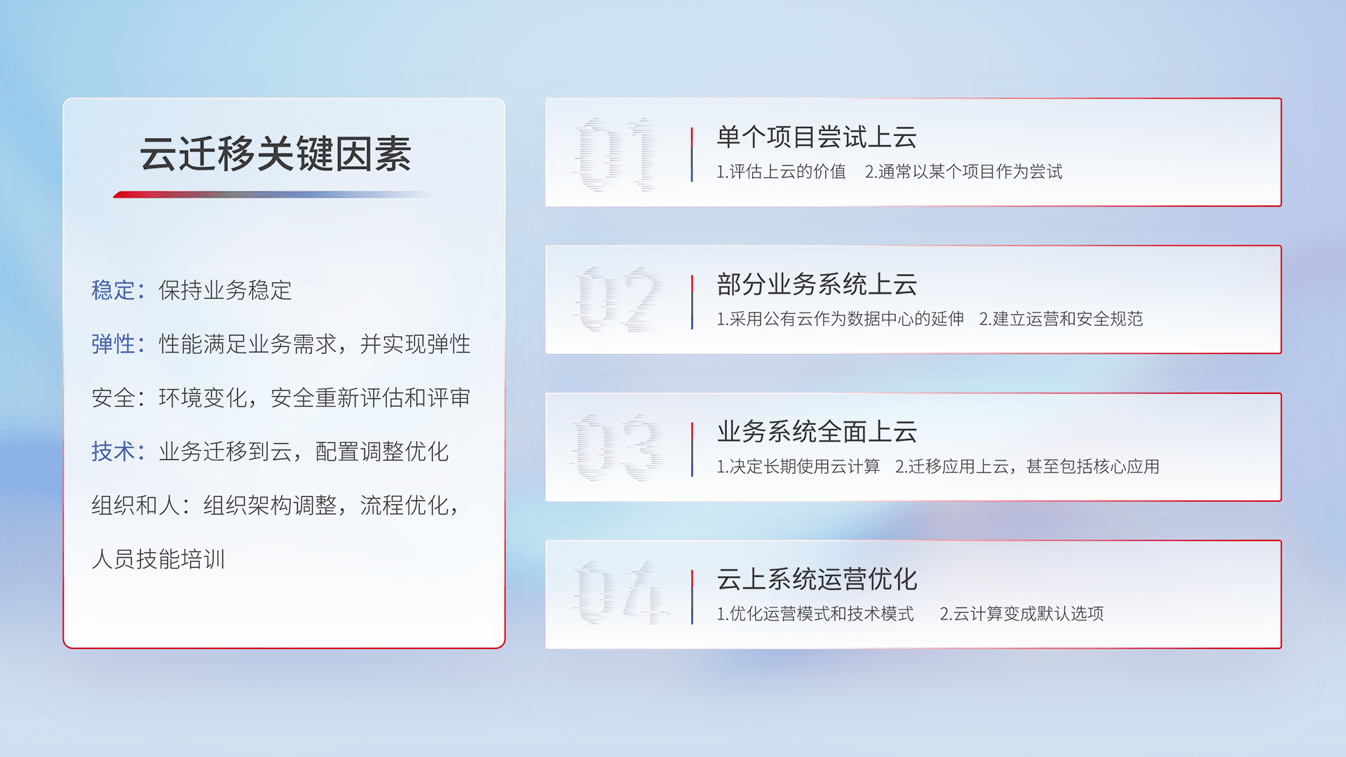 结合实际业务,,,从规划设计、、、、云平台选型、、、云原生改造、、、、数据迁移、、、、集成交付,,迁移全过程为客户识别最佳上云路径,,做好风险识别管理,,,设计网络架构、、身份权限、、、、安全审计合规、、操作审计、、、日志审计、、、监控告警策略、、多站点容灾设计等,,对云上基础设施进行整体规划,,提升IT治理水平,,以满足弹性、、高可用、、、、高性能的需求。。。。