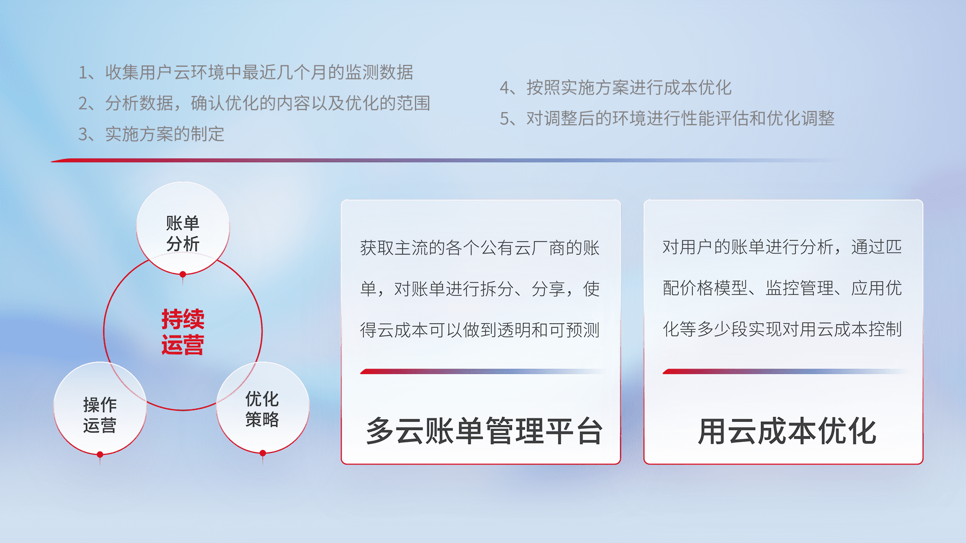 通过多云纳管,,,,以统一的资源数据模型把客户的云资源进行抽象和封装,,,进而实现对多云资源的统一操作,,,保障云资源管理的可靠性、、、稳定性与可用性。。量身定制化运维内容,,配置、、、、开发运维、、补丁管理、、备份、、监控、、、、认证和访问管理、、、、审计和日常巡检等,,,,保障在用云过程中的可靠度,,,,稳定度以及高可用率。。。
